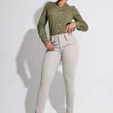 Este pantalón skinny de talle alto está diseñado para realzar la silueta con estilo. Su corte ceñido se adapta perfectamente al cuerpo, resaltando las piernas y las curvas con un ajuste cómodo y favorecedor.