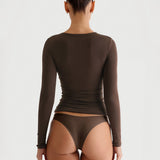 Confeccionado en un tejido de modal ultrasuave con efecto segunda piel, este crop top ajustado de manga larga se adapta al cuerpo con una sensación ligera y cómoda. Su diseño minimalista con cuello redondo y mangas largas lo convierte en una prenda esencial para el día a día, perfecta para crear looks sencillos y elegantes sin esfuerzo.