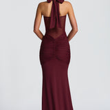 Vestido largo burdeos con espalda descubierta y drapeado